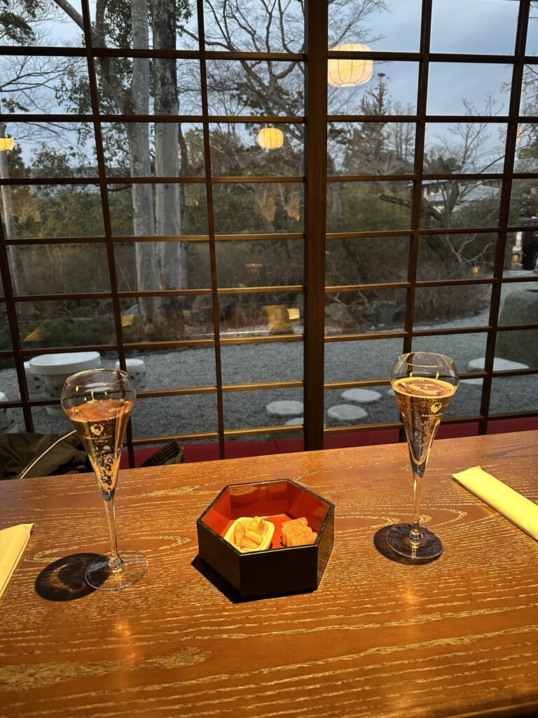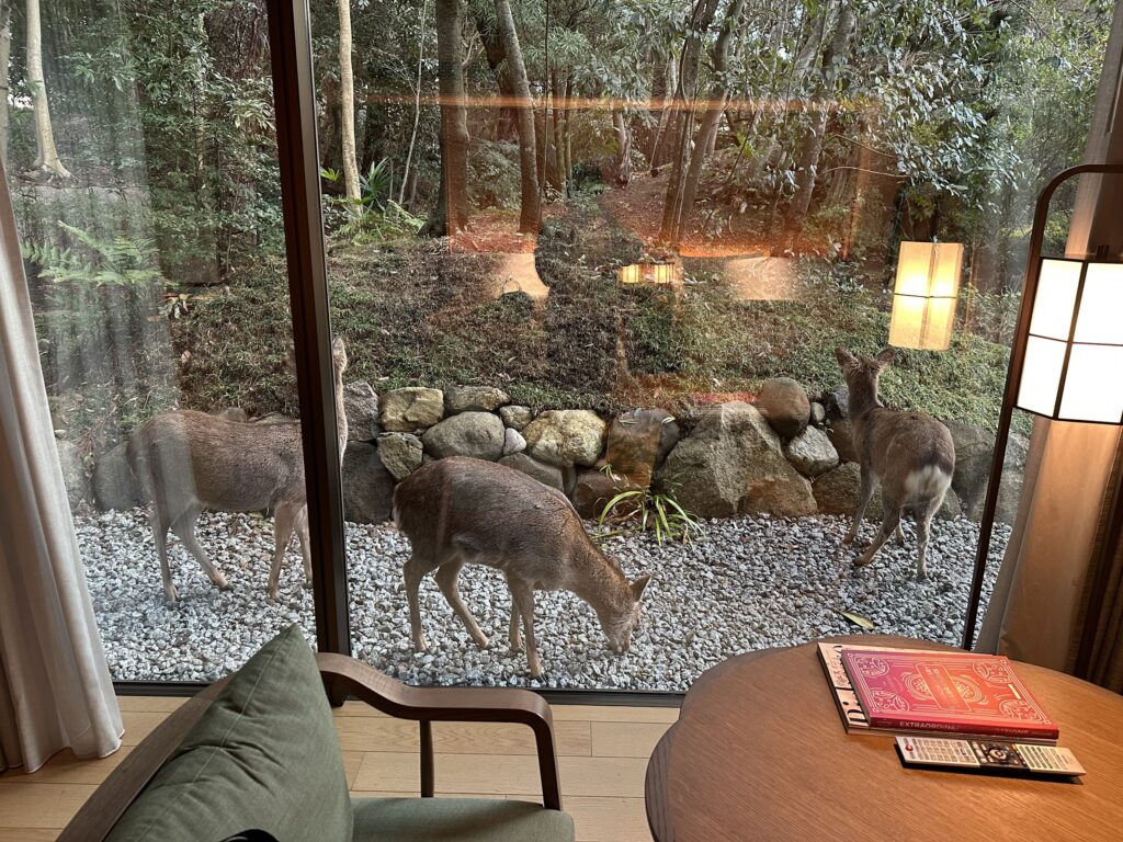 カーテンを開けると目の前は素敵な庭園が広がります。そしてなんと、部屋に入ってすぐ私たちのお部屋の目の前まで鹿さんが遊びに来てくれていました。あまりにもタイミングが良かったので食事の際にホテルのスタッフさんに聞いてみましたが、本当にたまたまだそう・・