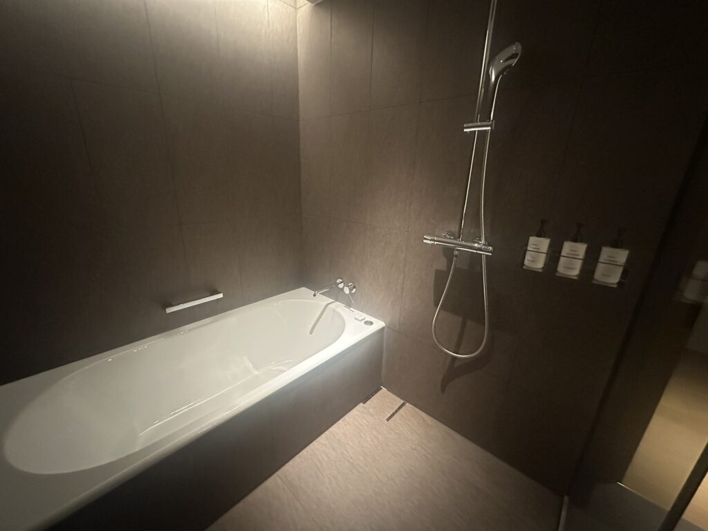 バスルームは独立タイプで、通常のシャワーとオーバーヘッドシャワーが設置されています。湯船も十分に足を延ばして入れる広さでした!