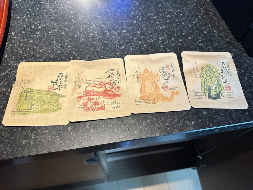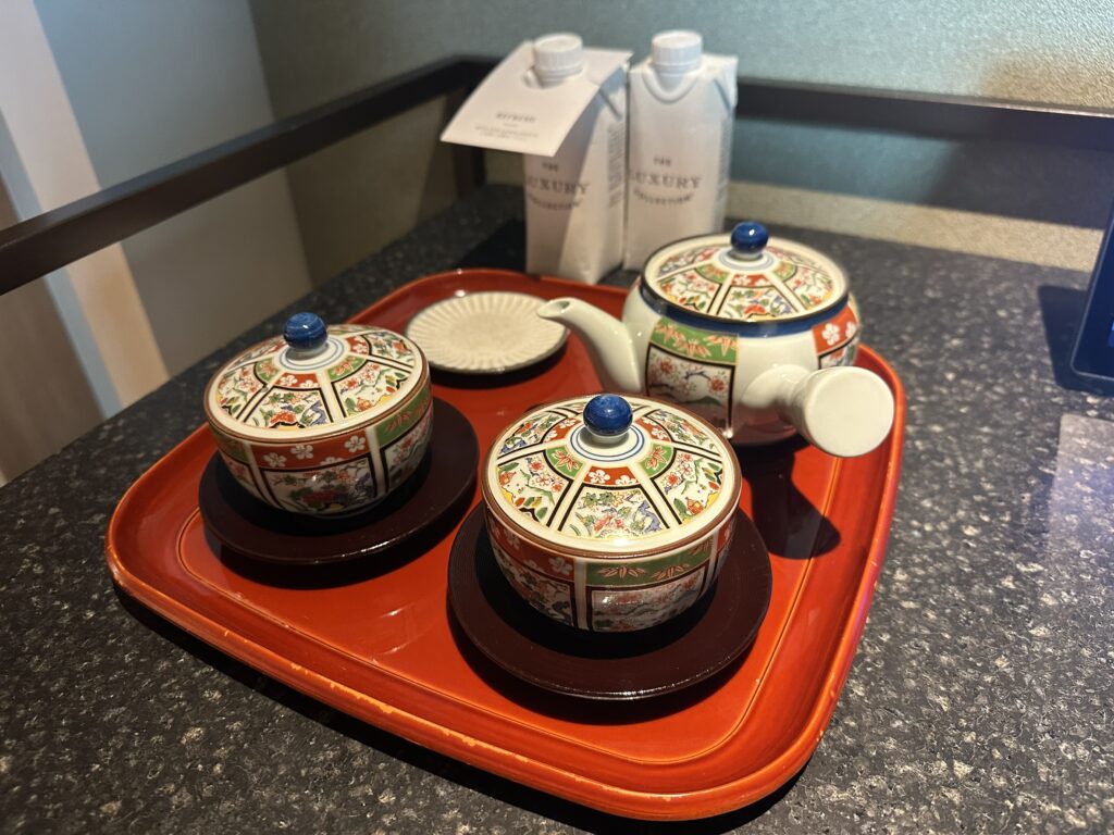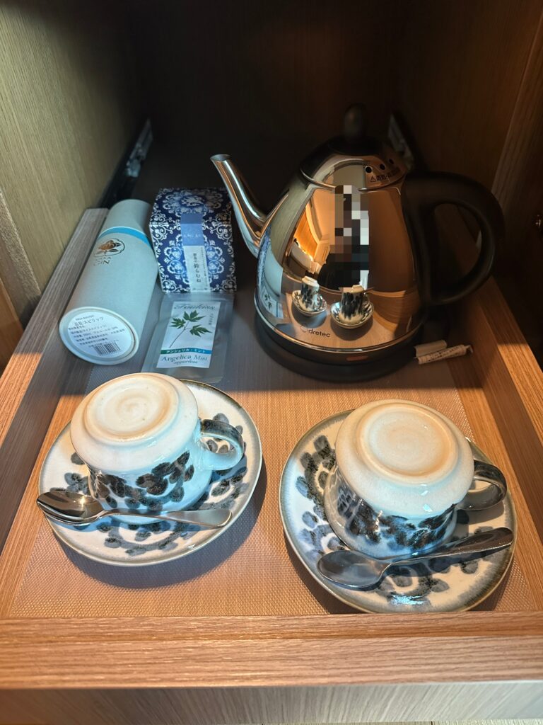 こちらはとってもかわいい茶器。個人的にこの湯呑がかなりツボでした!奥の白いパックはお水です。初めて見るタイプのパックだったため、恐る恐る飲みましたが何の変哲もないお水でした。(当たり前)